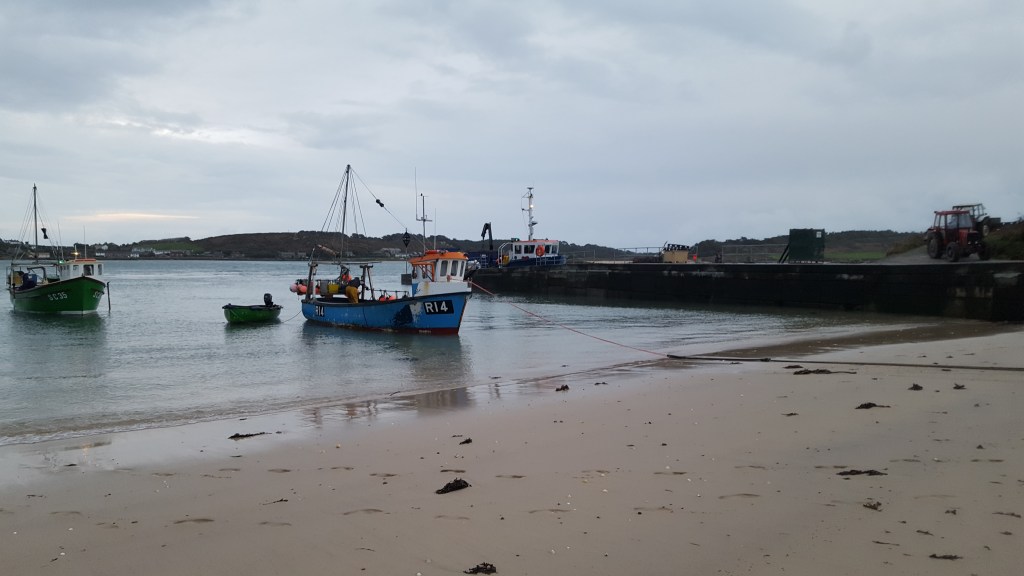 The quay is a hive of activity today and we watch like seals from the water as the children catch their boat to school. The cargo launch arrives bringing essential supplies to the island. Men with tractors and tractors line up to sort and collect goods. Two of the islands fishing boats chug into the bay, Emerald Dawn and Tradewinds, the fishermen preparing them to be taken out of the water for winter maintenance.