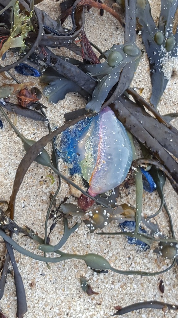 Heading toward home now, back along the beach at Great Par, where hundreds of By-The-wind Sailors have washed up, along with several Man of War jellyfish. Their irredescent colours gleaming in the sunlight.