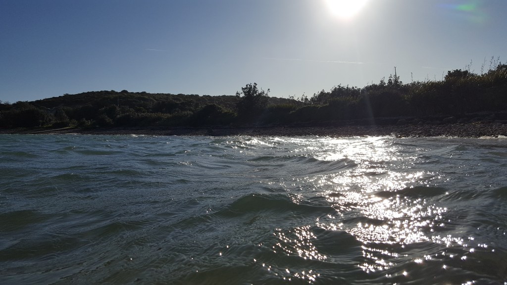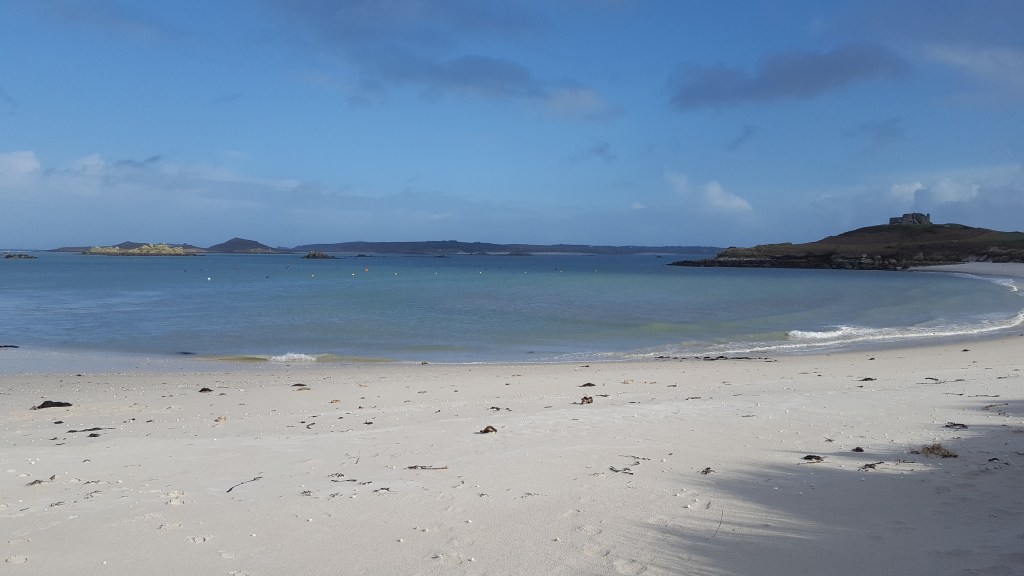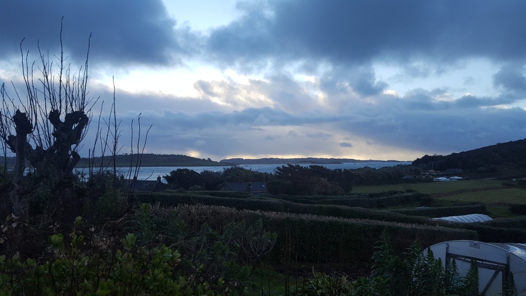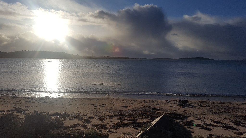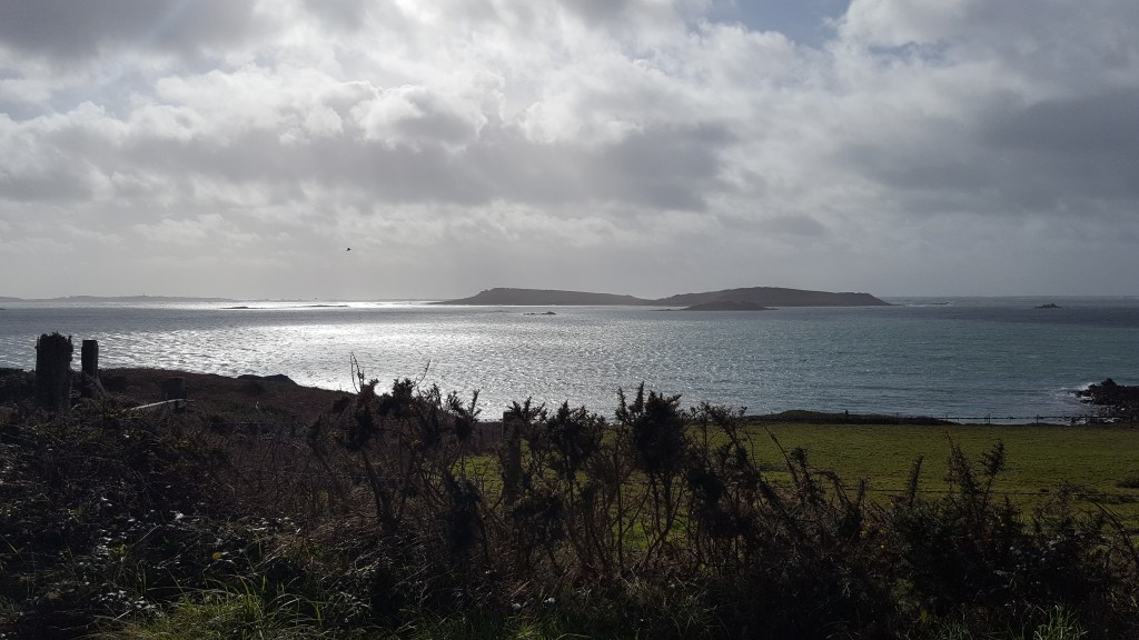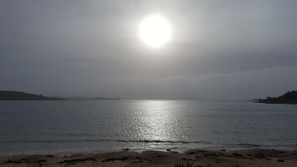 The sun is frosted behind shifting grey cloud, the sea silver and St Mary’s a hazy faded shape on the horizon.