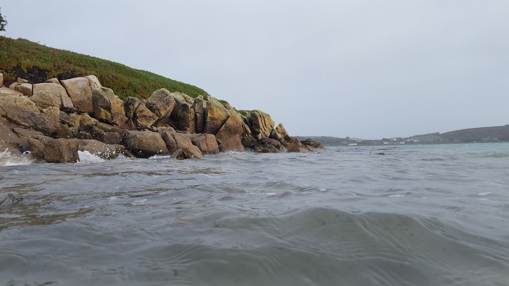 A fresh westerly breeze hurries the sea along, seemingly to push it around the rocks on my left and up towards Bar and Cromwells castle. But once in the water I can feel the suck of the tide, pulling me in the opposite direction, down channel towards Samson. I slowly make my way around the little rocky headland. With my back to the sun the sea is now a grey-green, little glass bubbles spreading from my fingertips.