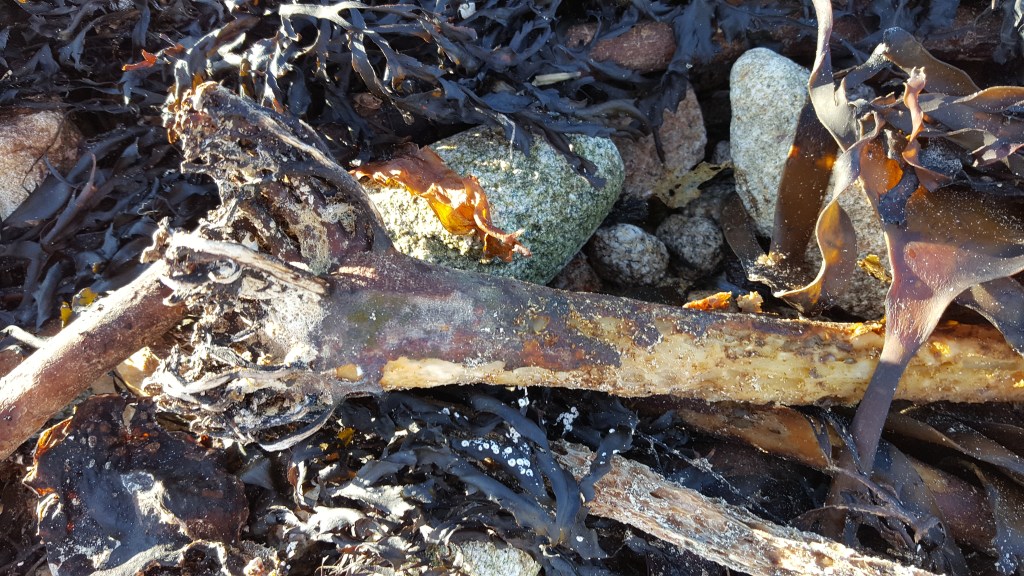 There is a sharp easterly wind that cuts flesh from bone. The beach is exposed and unprotected. Strewn over the granite pebbles are thick kelp stalks. Once nourished and full of life they now lie decaying, ancient, mumified and skeletal.