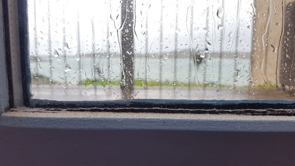 Sitting by the windows I wonder at how amazing glass is. Sheltering me from the wind and rain with barely two inches of thickness. I imagine I could almost push my hand through it’s liquid form and out into the cold outside. I can hear the drips of rain, feel the draft flow through the gaps and yet I am safe and warm and cocooned.