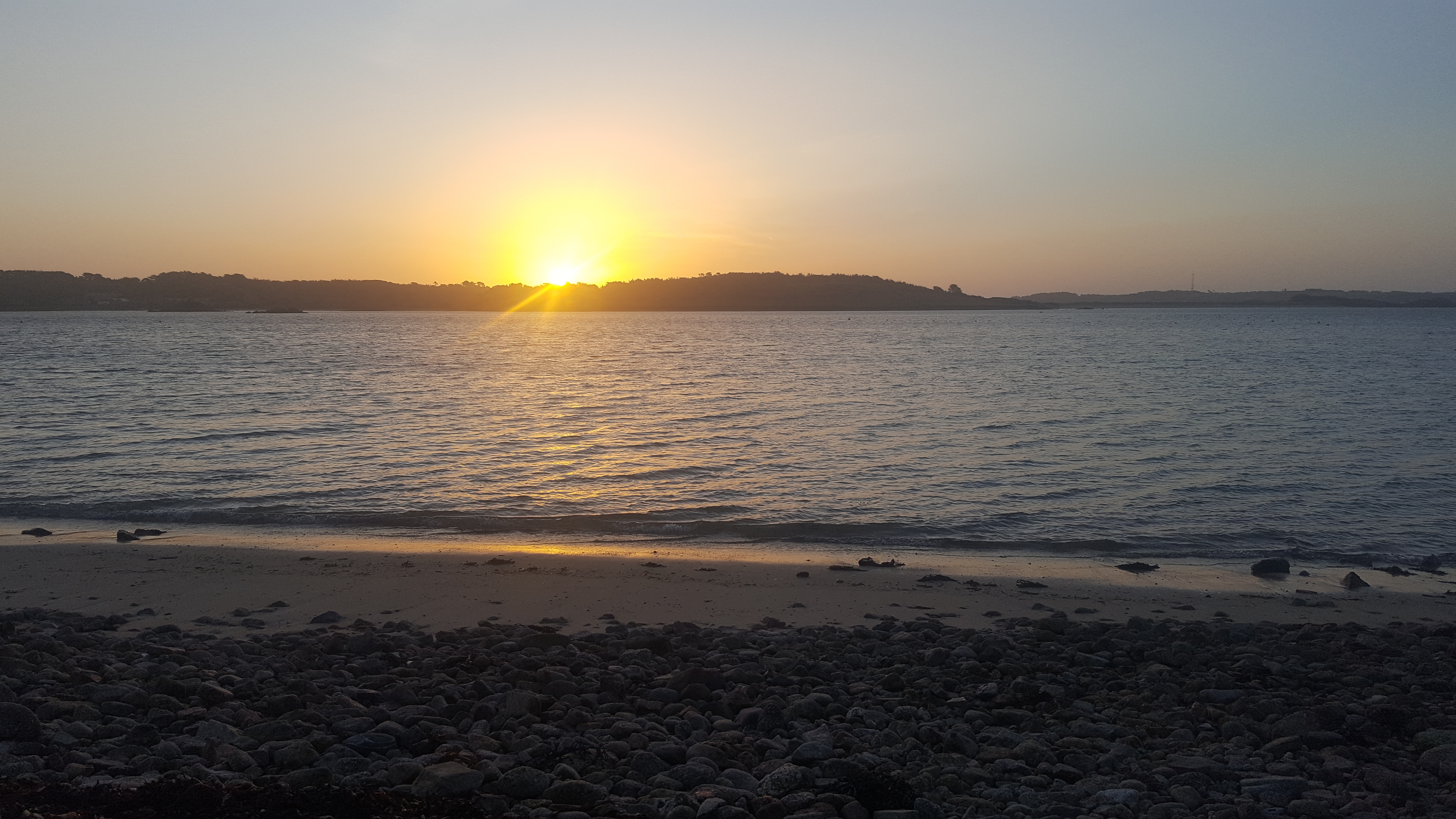The sea is calm but gently flurried by the cool morning breeze. As I sit quietly on the rocks at Green Bay, the golden orb of light breaks across the Tresco horizon and the sea turns to liquid gold.